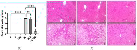 Analysis of hepatic parameters. Steatosis scores (a). Liver photomicrograph (b). A = Control; B = High-fiber control; C = Control supplemented with fructooligosaccharides; D = Hyperlipidic control; E = Hyperlipidic rich in fiber; F = Hyperlipid supplemented with fructooligosaccharides. Data are reported as mean ± standard deviation for a period of 18 weeks. **** indicates significantly different (p < 0.0001). N = 60.