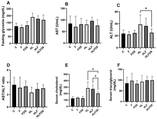 Comparison of serum levels of fasting glucose, aspartate aminotransferase (AST), alanine aminotransferase (ALT), cholesterol and triglycerides according to the experimental group. C—control group; F—high-fiber normolipid diet group; FOS—normolipid diet with FOS group; HL—high-fat diet group; HLF—fiber-rich, high-fat diet group; HLFOS—high-fat diet with FOS group. FOS—fructooligosaccharide. (A) Fasting glycemia (mg/dL); (B) AST (U/mL); (C) ALT (U/mL); (D) AST/ALT ratio; (E) Serum cholesterol (mg/dL); (F) Serum triacylglycerol (mg/dL). * indicates significantly different (p < 0.0004). N = 60. Data are reported as mean ± SD.