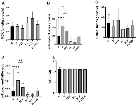 Liver analyses of malondialdehyde (MDA), retinol, α-tocopherol and total antioxidant capacity (TAC) according to the experimental group. C—control group; F—high-fiber normolipid diet group; FOS—normolipid diet with FOS group; HL—high-fat diet group; HLF—fiber-rich, high-fat diet group; HLFOS—high-fat diet with FOS group. FOS—fructooligosaccharide. (A) MDA (µmol/g protein); (B) α-Tocopherol (nmol/g tissue); (C) Retinol (nmol/ g tissue); (D) α-Tocopherol/ MDA ratio; (E) TAC (µM). * indicates significantly different (p = 0.02), ** indicates significantly different (p < 0.0025), **** indicates significantly different (p < 0.0001). N = 60. Data are reported as mean ± SD.