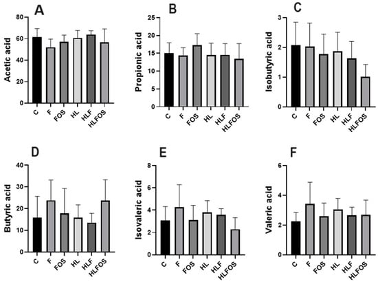 Comparison of concentrations of short-chain fatty acids analyzed in feces according to the experimental group. C—control group; F—high-fiber normolipid diet group; FOS—normolipid diet with FOS group; HL—high-fat diet group; HLF—fiber-rich, high-fat diet group; HLFOS—high-fat diet with FOS group. FOS—fructooligosaccharide. (A) Acetic acid; (B) Propionic acid; (C) Isobutyric acid; (D) Butyric acid; (E) Isovaleric acid; (F) Valeric acid. N = 60. Data are reported as mean ± SD.