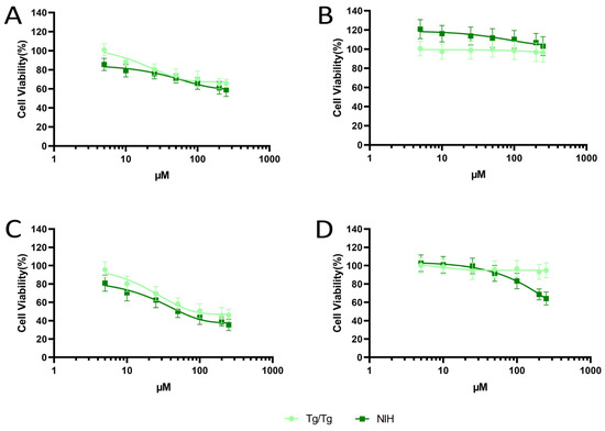 Viability of Tg/Tg and NIH/3T3 cells post treatment with fisetin for 24 h (A) and 48 h (C), and with morin for 24 h (B) and 48 h (D).