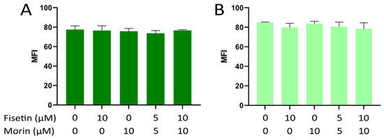 Our findings are consistent with the literature, which suggests that fisetin and morin do not act as prooxidants but primarily function as antioxidants after cells are exposed to oxidative stress. Fisetin reduces ROS production triggered by cellular stress stimuli in a dose-dependent manner, observed in both cardiomyocytes (H9C2) [51] and hepatocytes (L02, AML12) [52]. Morin shows similar results in limiting the intracellular generation of ROS in neuroblasts (N2A) and in lung fibroblast cells (V79-4) [53,54]. In neural cells (N2A), the overproduction of ROS induced by high glucose was significantly reduced after treatment with morin, indicating its inhibitory effect on ROS formation [53].