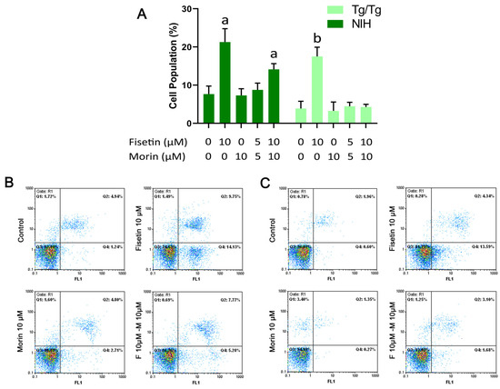 Apoptotic cell population after 24 h treatment of cells with one dose of fisetin and morin individually (10 μΜ) or two doses of combined fisetin and morin (5 μΜ and 10 μΜ), in NIH/3T3 and Tg/Tg cells (A). Representative flow cytometry images in NIH/3T3 (B) and Tg/Tg cells (C). Statistically significant difference from control (NIH/3T3) (symbol a) and Tg/Tg (symbol b) (p < 0.05).