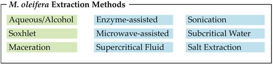 Plants such as M. oleifera are natural sources of polysaccharides, proteins, and vitamins. Depending on the specific bioactive compound or application, a proper extraction method must be selected to achieve a high yield and quality of the isolated components [46]. Conventional techniques such as aqueous or ethanolic extraction have been employed for centuries now, with the past few decades seeing the development of modern methods such as microwave-assisted extraction or supercritical fluid extraction [47,48]. Figure 3 presents a summary of the techniques employed to isolate bioactive compounds from M. oleifera.
