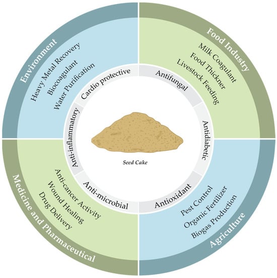 As a sustainable and eco-friendly resource, M. oleifera seed cake is a valuable by-product with various industrial applications (Figure 4). One of its first and most common uses is in agriculture as an organic fertilizer, since the nutritional and chemical composition of the cake provides the soil with much-needed elements such as potassium and nitrogen, increasing soil fertility and enhancing crop yields [57]. The application of seed cake as a fertilizer is more advantageous (eco-friendly) than the synthetic ones that usually lead to soil degradation and environmental contamination. With proven insecticide and fungicide properties, M. oleifera seeds can also act as a pest control agent [58]. Plant and soil pathogens can be tackled with purified extracts from M. oleifera seeds, as demonstrated by Sousa et al. [59]. The development and growth of Meloidogyne incognita, a common soil-borne pathogen, are strongly affected by the activity of exuded seed proteins, leading to the nematode cell’s death. Purified lectins from the cake showed insecticidal effects on larvae, eggs, and the oviposition of Aedes aegypti, also known as the yellow fever mosquito, associated with the spreading of diseases like dengue, zika, and yellow fever [60].