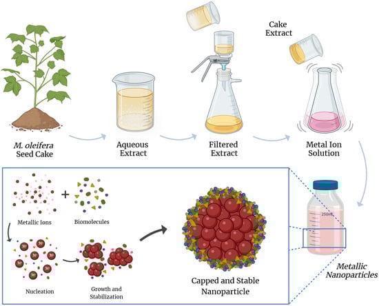 A sustainable route to NP synthesis using M. oleifera seed cake biocomponents as the reducing and stabilizing agents. Components such as alkaloids, flavonoids, phenolic acids, and proteins mediate the reaction and prevent the subsequent agglomeration and aggregation of nanoparticles. Created with BioRender.com.