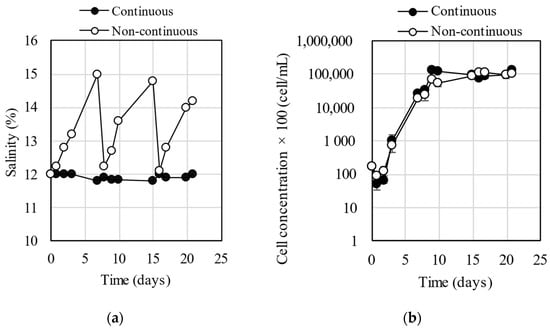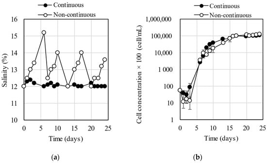 Continuous and non-continuous seawater addition to compensate for evaporation. (a) Salinity change over time and (b) cell concentration change over time.