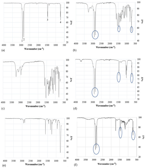 Figure 2a and Table 2 present a comparison between the absorption bands obtained from the recorded data and those found in polymer reference spectra. ATR-FTIR analysis of MPs exposed to atrazine for a 12-month period showed clear evidence of atrazine being retained on the MP surface. Figure 2b shows that, in addition to the four peaks associated with the original MPs (Figure 2a), twelve additional peaks appear that correlate with peaks on the atrazine reference spectrum (Figure 2c). These peaks are at 3300 cm−1, 3150 cm−1, 1618 cm−1, 1544 cm−1, 1401 cm−1, 1343 cm−1, 1304 cm−1, 1264 cm−1, 1165 cm−1, 1128 cm−1, 1056 cm−1, 991 cm−1, 809 cm−1, and 803 cm−1. For MPs exposed to 1,3-dichloropropene (Figure 2d,e) and naphthalene (Figure 2f,g), the same type of correlation was not observed; however, a number of additional peaks appear on MP spectra after exposure (Figure 2d,f), which are not present for the original MPs (Figure 2a). The additional peaks that appear in Figure 2d,f do not appear in the spectra for MPs exposed to atrazine or fluorene, so they cannot be ascribed to degradation of the polymer. These peaks are, therefore, attributed to sorption of 1,3-dichloropropene and naphthalene on the surface of the MPs; however, these pollutants do not seem to be retained on the MPs to the same extent as atrazine.