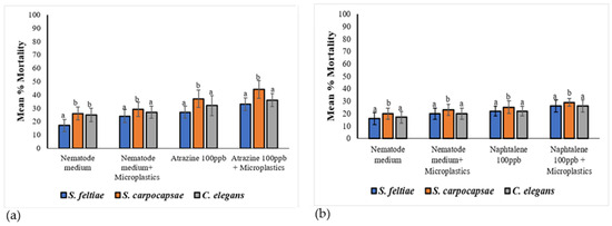 After 72 h exposure, the results showed high mortality in S. carpocapsae IJs and C. elegans J3 in all the treatments containing MPs compared to mortality in S. feltiae SB12(1) IJs. However, S. carpocapsae IJs were the most sensitive to all the treatments during both 72 and 96 h time exposures. In addition, S. carpocapsae IJs were more significantly affected by MPs with all the treatments compared to S. feltiae SB12(1) IJs and C. elegans J3 (p < 0.05) (Figure 3). Steinernema feltiae SB12(1) IJs were the least affected in all the treatments. There was only a significant difference between the mortality of S. feltiae SB12(1) IJs exposed to the combination treatments of atrazine with no MPs and the mortality in the treatment with MPs (p < 0.05), which confirms that MP particles have some impacts on nematodes. Mortality of the three nematode species was significantly higher in the combination treatments of 1,3-dichloropropene with no MPs and with MPs (F = 2.861, p = 0.002724) in comparison to the treatments with atrazine, naphthalene, and fluorene. Investigating nematode exposure to MP particles in different treatments revealed that chemicals adhere to MPs and are subsequently transferred into nematodes. Acute exposure to contaminated MP particles resulted in a time- and dose-dependent increase in nematode mortality. All three nematode species were readily affected by MP treatments; however, the mean mortality percentage was significantly different among all the treatments (Figure 3).