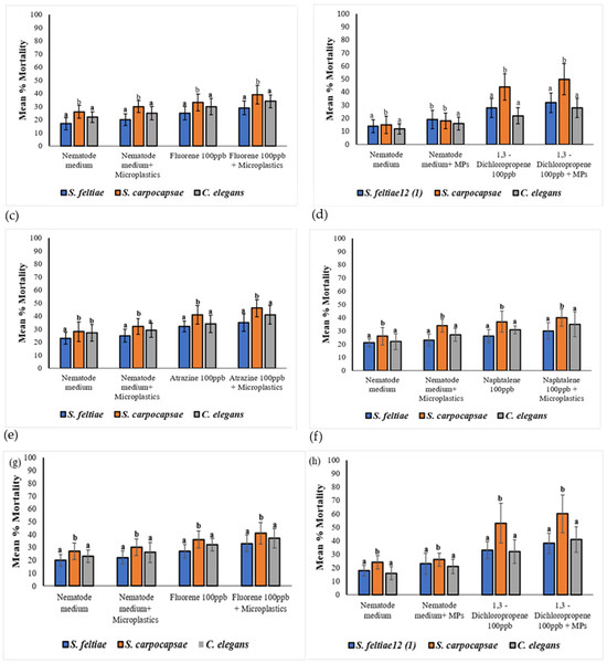 Significant differences in mortality of all species were observed among certain treatments containing MPs. For example, after 96 h exposure, S. carpocapsae IJ mortalities caused by atrazine and 1,3-dichloropropene were significantly (p < 0.05) higher compared to those caused by naphthalene and fluorene in the same nematodes. Overall, there was a significant impact of MPs on the three nematode species among the treatments. Microplastics treated with 1,3-dichloropropene were found to be the most toxic treatment in this bioassay, as most nematodes were affected, which was not the case for the rest of treatments (Figure 3a–h).