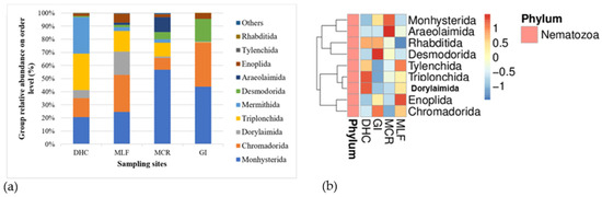The relative abundances of the 10 most prevalent nematode genera in the RB sediment samples obtained by 18S rDNA gene sequencing are summarised in Figure 7a. The dominant genera groups in the river sediment nematode community of DHC were Triplonchida and Mermithida, both with a relative abundance of 28%, followed by Monhysterida (21%). Chromadorida was less abundant in MCR (9%), but dominated in MLF (28%), followed by Monhysterida (25%). Desmodorida was mainly identified in MCR (6%) and GI (17%). Araeolaimida was not present in the other two locations, with lower abundance observed in the MLF (2%) and MCR (11%). However, the main nematode group in the sediment nematode communities of MCR and GI was Monhysterida, with relative abundances of 57% and 44%. On the other hand, Chromadorida was dominant in the GI (34%) and MLF (28%) samples, followed by Dorylaimida, which was in abundance in the MLF (20%) and DHC (34%) samples. Desmodorida was in a higher abundance in the GI (17%) samples and lower in the DHC (1%) samples. Monhysterida and Araeolaimida were mostly dominant as nematode orders in MCR compared to the rest of the locations (Figure 7a). The heatmap shows that the orders Monhysterida and Araeolaimida were mostly dominant in the sediment samples from MCR compared to sediment samples from the other three locations, followed by Dorylaimida, Triplonchida, and Tylenchida, which were in higher abundances in the DHC and MLF samples (Figure 7b).