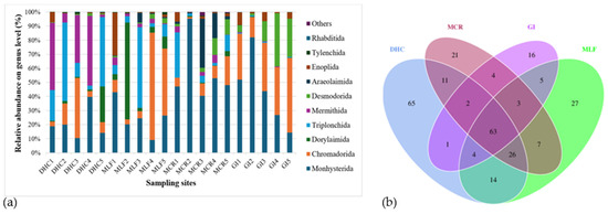 At the genus level, there was a high diversity of nematodes within the DHC, MLF, and MCR samples, and a much lower diversity was observed in the GI samples. Monhysterida OTUs were identified in all the samples from the four locations, representing averages of 21 ± 11%, 25 ± 12%, 57 ± 22%, and 44 ± 26% of the total genera from the DHC, MLF, MCR, and GI samples, respectively (Figure 8a). In order to study the differences in nematode communities, the distribution of OTUs was measured. The analysis revealed that 63 OTUs were shared among all the samples. In addition, 16 unique OTUs were found in GI, 21 in MCR, 27 in MLF, and 65 in DHC (Figure 8b).
