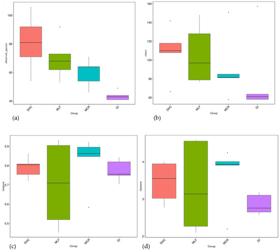 Alpha diversities of the nematode communities associated with the river sediment samples from DHC, MLF, MCR, and GI; observed species, Chao1, Simpson, and Shannon are displayed in (a,b,c,d), respectively.