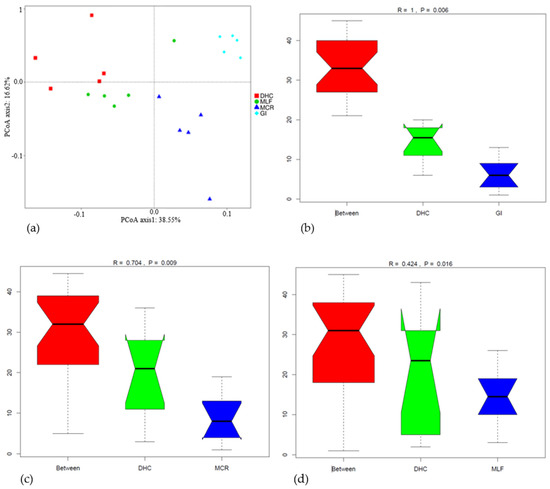 Beta diversity, shown in Figure 10, also confirmed significant differences in nematode communities among the four locations. The two principal component axes explained 55.17% of the total variation in the nematode community; specifically, the PC1 axis explained 38.55% while the PC2 axis explained 16.62% of this variation (Figure 10a). Nematode communities from three locations (GI, MCR, and MLF) were clustered together, separate from that in DHC. In addition, some DHC and MLF samples were clustered together. The nematode community structures in samples from each location were significantly different. Sediment samples from DHC, for example, were well dispersed, but two samples from this location were clustered with four samples from the MLF location. Principal component analysis (PCA) demonstrated sample separation at the OTU level from the four locations. Furthermore, analysis of similarity (Anosim) and permutational MANOVA indicated that significant differences existed among the nematode communities in the twenty river sediment samples across the four locations (Figure 10b–g), indicating that MP pollutants in the sediments have a significant impact on nematode communities.