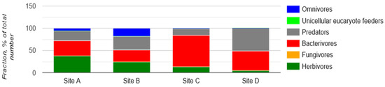 Sediment samples from the four locations presented a significant difference in nematode trophic group abundance. Sediment samples from DHC—site A (38.37%) had the highest abundance of herbivores, followed by those from MLF—site B (23.97%). The lowest numbers of herbivores were observed in MCR—site C (13.29%) and GI—site D (4.9%) samples. The abundance of bacterivores was significantly (p = 0.01) higher in MCR—site C (70.47%) and GI—site D (44%), followed by DHC—site A (33.4%). The lowest number was observed in MLF—site B (27.3%). The abundance of predators was the highest in sediment samples from GI—site D (50.9%) and MLF—site B (30.8%), followed by DHC—site A (21.8%). The lowest number was observed in sediment samples from MCR—site C (15.1%). Moreover, omnivores were found to decrease in abundance in line with the most polluted locations, DHC—site A (6.5), MCR—site C (1.1), and GI—site D (0.1), compared to MLF—site B (17.9), which had the highest abundance (Figure 11).