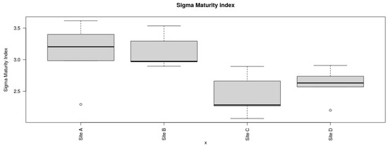 The maturity indices at site B for MLF (2.77 ± 0.51) exhibited a slightly greater value in comparison to site A for DHC (2.29 ± 0.44), site C for MCR (2.2 ± 0.16), and site D for GI (2.54 ± 0.27), as depicted in Figure 13. There was no significant difference in maturity indices among the four locations (p= 0.154). However, the maturity indices of the four locations were less than 3, indicating low sediment food web maturity indices and persistence of MP pollutants among the four locations [43]. In contrast, there were significant differences among the sigma maturity indices (ƩMI) between the four locations (p < 0.05) (Figure 14): site B for MLF (3.13 ± 0.27), site A for DHC (3.10 ± 0.51), site C for MCR (2.43 ± 0.33), and site D for GI (2.61 ± 0.26).