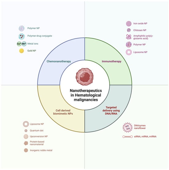 Nanotherapeutic strategies in hematological malignancies, including categories such as chemonanotherapy and immunotherapy. (Created in BioRender. Mahmoud, A. (2025)).