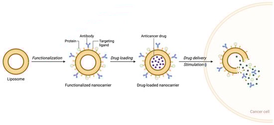 Schematic representation of liposome-based nanocarrier functionalization and drug delivery to cancer cells. (Created in BioRender. Mahmoud, A. (2025)).