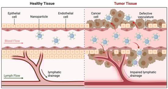 Passive targeting relies on the enhanced permeability and retention (EPR) effect, which is characteristic of tumor tissues. Tumors tend to have leaky vasculature due to the rapid and abnormal growth of blood vessels, coupled with poor lymphatic drainage. This phenomenon allows nanoscale drug carriers to accumulate preferentially at tumor sites. Nanocarriers typically range from 10 to 200 nanometers, making them ideally suited to pass through these leaky vessels and reach the tumor microenvironment [67] (Figure 5).