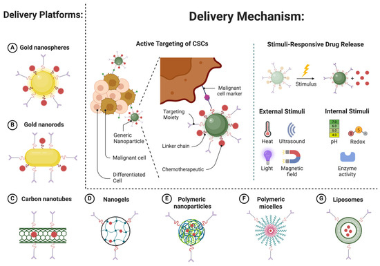 Stimuli-responsive nanocarriers represent an advanced strategy for achieving site-specific drug release by responding to unique environmental cues present within the tumor microenvironment. These stimuli can be internal (e.g., pH, enzyme activity, or redox potential) or external (e.g., temperature, magnetic field, or light). The ability of these nanocarriers to release their payload in response to specific stimuli provides a higher level of control, allowing drugs to be activated only at the intended site of action, thereby minimizing systemic side effects [85,151,152].