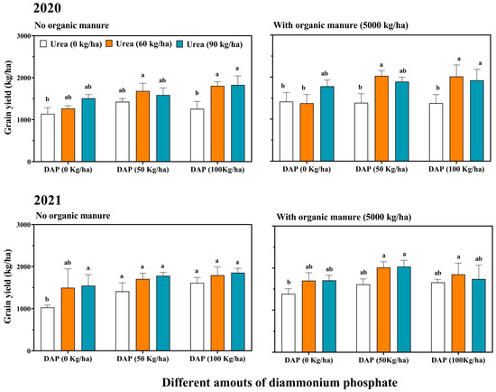 Figure 3. The effects of different fertilizer treatments on increasing common bean grain yield parameters over two years (2020 and 2021). The letters on the top of bars show differences among treatments according to Tukey’s HSD at a 5% level. The DAP indicates diammonium phosphate.