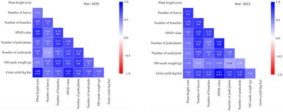The growth and yield parameters showed a great correlation among the increased parameters (Figure 4). In 2020, the number of leaves revealed a positive correlation (r = 0.65) with the number of branches. Similarly, the number of branches showed close correlations with the number of pods (r = 0.77) and 100 seed weight (r = 0.78). Moreover, the SPAD value correlated highly with plant height (r = 0.80) and grain yield (r = 0.84). In 2021, the number of leaves indicated a strong relationship with the number of branches (r = 0.78), SPAD value (r = 0.80), and number of pods per plant (r = 0.78). Likewise, the grain yield had a positive correlation with the number of leaves (r = 0.75), SPAD value (r = 0.91), number of pods per plant (r = 0.77), and number of seeds per pod (r = 0.76).
