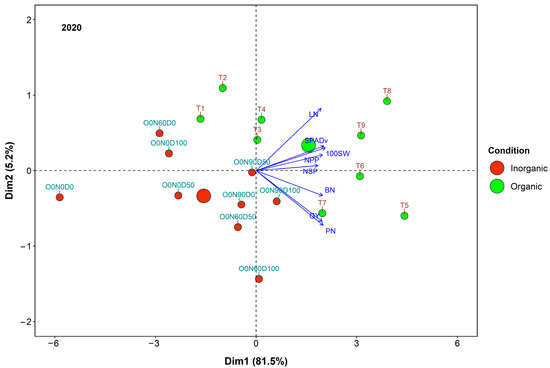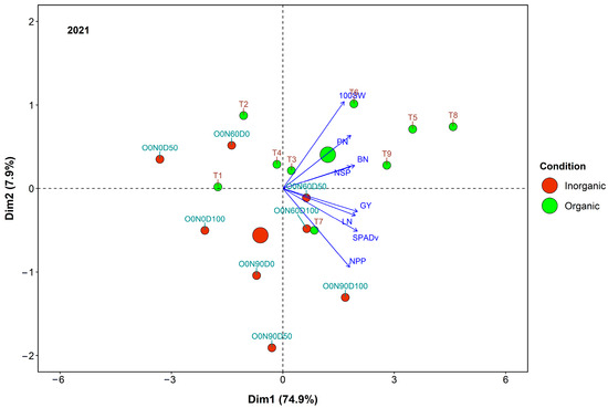Figure 5. Principal component analysis of two years of experiments concerning the applied fertilizers’ treatments, growth, and yield parameters. The letters of treatments in organic conditions present T1:O5000N0D0, T2:O5000N0D50, T3:O5000N0D100, T4:O5000N60D0, T5:O5000N60D50, T6:O5000N60D100, T7:O5000N90D0, T8:O5000N90D50, and T9:O5000N90D100. The growth attributes parameters are abbreviated as PH: plant height (cm), LN: leaf number, BN: branch number, SPADv: soil and plant analyzer development value, NPP: number of pods/plant, NSP: number of seeds/pod, 100SW: 100 seeds weight (g), GY: grain yield (Kg/ha).