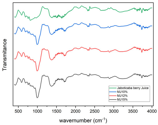 From the FTIR spectroscopy, it is possible to evaluate the secondary structure of proteins and changes in the secondary structure in the presence of ligands. Figure 1 shows the spectra of non-microencapsulated jaboticaba juice and microencapsulated jaboticaba juice powder in different proportions: MJ 10%, MJ 12%, and MJ 15%. The spectra revealed broadbands in the region of 3000–3500 cm−1, corresponding to unsaturated O-H hydroxyl bonds. Bands close to 2900 cm−1 were attributed to the stretching vibrations of the C-H bonds. In addition, several peaks have been observed in the region of 1500–1750 cm−1 and wide peaks in the region between 1000 and 1500 cm−1.