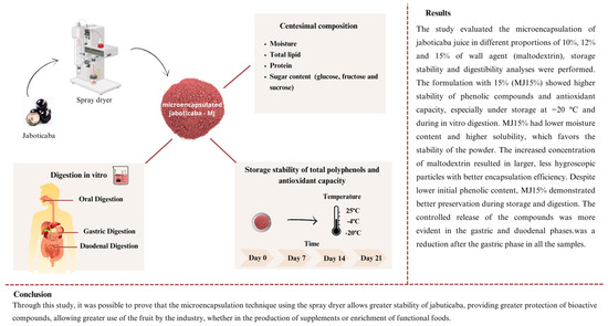 This study demonstrated that microencapsulation technology significantly increased the total phenolic content of jaboticaba juice compared to non-microencapsulated juice. Maltodextrin, used as a wall material, effectively protected these compounds from degradation during the spray-drying process. The highest maltodextrin concentration (MJ 15%) led to an increase in particle size while reducing moisture levels, water activity, and hygroscopicity. Additionally, the solubility of the microcapsules was directly influenced by maltodextrin concentration, while color parameters remained stable, indicating a protective effect against heat of the drying process. Microencapsulation effectively preserved the stability of phenolic compounds and the antioxidant capacity of jaboticaba over time and at varying temperatures compared to freeze-dried jaboticaba without maltodextrin. Moreover, the technique significantly increased the stability of jaboticaba’s bioactive compounds throughout all stages of in vitro digestion, reinforcing its potential for functional ingredients development. These findings highlight microencapsulation with maltodextrin as a promising strategy for protecting the bioactive components of jaboticaba, improving its applicability in functional food formulations, and ensuring greater stability during refrigerated storage. Future research should explore the health benefits of consuming microencapsulated jaboticaba, along with its sensory properties and commercial viability. The microencapsulation technique presents opportunities for incorporating of jaboticaba into a wide range of food products, such as yogurts, cakes, and cookies, expanding its applications in the food industry.