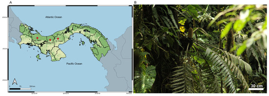 We sampled adult plants of Zamia pseudoparasitica from three protected forest sites located on the Atlantic slope of western Panama: the Palo Seco Protected Forest in Bocas del Toro Province (hereafter, “Palo Seco”; 8°47′27.0″ N, 82°11′38.4″ W; 628 m.a.s.l.), Santa Fe National Park in Veraguas Province (as “Santa Fe”; 8°31′53.5″ N, 81°09′00.9″ W; 812 m.a.s.l.), and General de División Omar Torrijos Herrera National Park in Coclé Province (as “El Copé”; 8°40′04.9″ N, 80°35′27.5″ W; 754 m.a.s.l.) (Figure 1). These sites represent submontane evergreen tropical rainforests, characterized by daily temperatures ranging from 21 to 24 °C and annual rainfall between 1900–3000 mm. Zamia pseudoparasitica is a relatively common epiphyte in all these forests, with an average density estimate of 12.4 individuals per hectare [31].