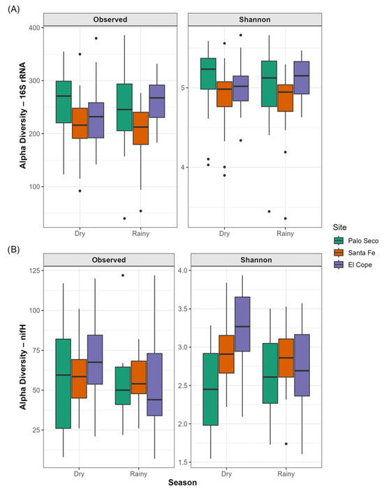 Alpha diversity estimates showed no statistically significant differences across sites or between seasons for either the 16S rRNA (Observed: p-value = 0.84; Shannon: p-value = 0.92) or nifH (Observed: p-value = 0.19; Shannon: p-value = 0.21) genes (Figure 3). However, visual inspection revealed some consistent patterns. For the 16S rRNA gene dataset (Figure 3A), samples from Palo Seco tended to show higher richness than those from Santa Fe, regardless of season, while El Copé exhibited intermediate values. For the nifH dataset (Figure 3B), diversity was more variable across sites and seasons, but El Copé tended to have higher diversity during the dry season compared to the other sites. These trends, while not statistically significant, may reflect site-specific ecological or microclimatic factors influencing phyllosphere microbial richness.