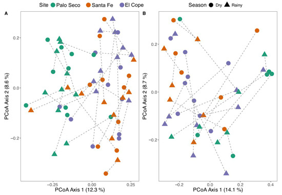 PERMANOVA based on Bray-Curtis distances revealed significant differences in bacterial community composition between sites for both the 16S rRNA gene (R2 = 0.106, p-value = 0.001) and nifH datasets (R2 = 0.085, p-value = 0.001) (Figure 4; Table S4). However, no differences were seen between the rainy and dry seasons (16S: R2 = 0.018, p-value = 0.15; nifH: R2 = 0.018, p-value = 0.47), although there was a significant interaction between site and season in the 16S rRNA data (16S rRNA gene: R2 = 0.42, p-value = 0.019; nifH: R2 = 0.40, p-value = 0.358). Similar results were obtained when using weighted UniFrac distances, where significant differences were detected between sites and for the site × season interaction (Table S3). Beta dispersion tests confirmed that community dispersion among sites was homogeneous for both markers (16S rRNA gene: p-value = 0.39; nifH: p-value = 0.56). While no differences in communities were seen within sites between the rainy and dry seasons, pairwise comparisons showed some statistically significant differences in community composition between sites and seasons for both the 16S rRNA and nifH genes, but these explained only a small portion of the variation (Table 2).