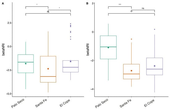 Community phylogenetic relatedness in the Z. pseudoparasitica phyllosphere based on the Beta Net Relatedness Index (βNRI) between study forest sites in the rainy (A) and dry (B) seasons. Analysis corresponds to the bacteria characterized with the 16S rRNA marker. Significant differences between sites are indicated on top of the brackets as follows: p-value = * 0.05 and *** 0.001, and “ns” indicates non-significant differences (p > 0.05).