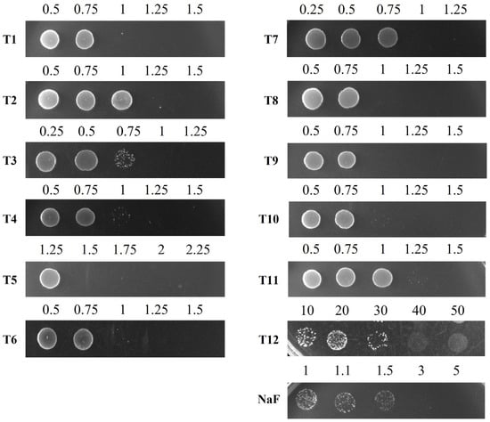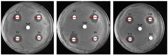 To evaluate antimicrobial activity against S. mutans, 12 toothpastes were analyzed using disk diffusion, MIC, and MBC (Figure 1 and Figure 2; Table 3 and Table 4). In the disk diffusion test, all toothpastes, excluding T12, had inhibition zones, with T1 having the largest (16.17 mm) and T5 the smallest (8.25 mm) inhibition zones. The control NaF (300 μg/mL) showed no inhibition zone (Figure 1, Table 3). These results suggest that T1 exhibits the highest antimicrobial activity. Notably, the lack of inhibition zones in the control group suggests no clear correlation between fluoride content and inhibition zone size. This was further supported by the relatively smaller inhibition zones of high-fluoride toothpastes with 1450 μg/mL fluoride (T8: 11.11 mm, T10: 14.28 mm) compared to those with 1000 μg/mL fluoride (T1). Hence, other chemical components also contribute to antimicrobial activity. In particular, the larger inhibition zone observed in the low-fluoride toothpaste (T3) containing 528 μg/mL fluoride compared to the high-fluoride toothpaste (T8) highlights the need to consider the fluoride release mechanism. The amount of released fluoride can be influenced by the toothpaste composition as well as the chemical composition and pH of the solution and medium [24].