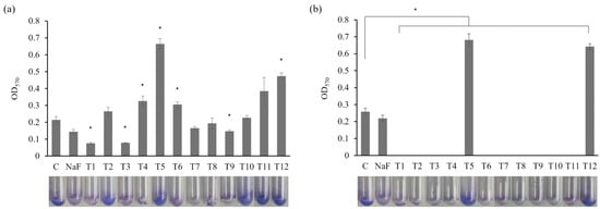 A biofilm-forming assay assessed the effects of commercial toothpaste on S. mutans (Figure 3). The sub-MIC concentrations and MIC values of certain toothpastes were applied. At 0.5 mg/mL, a significant reduction in biofilm formation was observed in the T1 and T3 treatment groups compared to the control and NaF control (Figure 3a; p < 0.05). Hence, these toothpastes effectively inhibited biofilm formation. The fluoride in T1 and the hydrogen peroxide in T3 possess antibacterial and antibiofilm properties [31,32]. Meanwhile, treatment with T5 or T12 increased biofilm formation compared with the control group. Similar results were observed at 0.75 mg/mL (Figure 3b), with all toothpastes, excluding T5 and T12, significantly inhibiting biofilm formation (p < 0.05). The increased biofilm formation observed under 0.5 mg/mL T5 and T12 treatment may be attributed to using toothpaste at concentrations lower than the MIC, allowing more bacteria to survive and resulting in greater biofilm formation. Generally, biofilms are protective structures that bacteria form as survival and defense mechanisms. Therefore, insufficient antibacterial effects can lead to bacterial proliferation and biofilm formation. Indeed, treating Enterococcus faecalis with subinhibitory antibiotic concentrations that inhibit cell wall synthesis increases cell lysis and extracellular DNA (eDNA) release, promoting biofilm formation [33]. Therefore, the increased biofilm formation in the T5 and T12 groups suggests insufficient antibacterial effects, prompting the bacteria to form biofilms as a survival strategy. These findings emphasize the need to analyze the combined effects of toothpaste ingredients at different concentrations on biofilm formation.