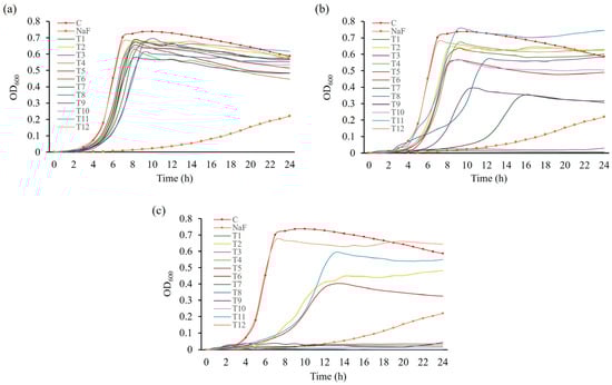 Growth curves of S. mutans in response to treatment with toothpastes at different concentrations. S. mutans was cultured in media treated with different concentrations of toothpaste for 24 h. Growth in media treated with (a) 0.5 mg/mL, (b) 0.75 mg/mL, and (c) 1 mg/mL toothpaste. NaF was used as a control at 300 µg/mL.