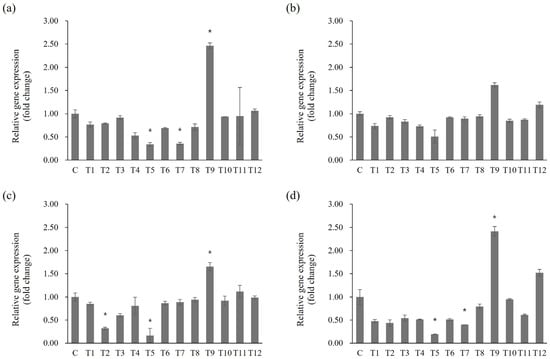 Statistically significant differences in gene expression following toothpaste treatment were evaluated based on the untreated control group, selecting genes with significant (≥2 fold) changes in expression for further analysis (Figure 5; p < 0.05). For the spaP gene, expression significantly decreased by 0.34 fold in T5 and 0.35 fold in T7, whereas expression increased by 2.47 fold under T9 treatment (Figure 5a; p < 0.05). gtfB expression decreased by 0.51 fold in T5 and increased by 1.62 fold in T9 (Figure 5b). gtfC expression significantly decreased by 0.32 fold in T2 and 0.16 fold in T5, and increased by 1.66 fold in the T9 group (Figure 5c; p < 0.05). For gtfD, expression decreased significantly by 0.19 fold in T5 and 0.40 fold in T7, whereas it increased significantly by 2.42 fold in T9 (Figure 5d; p < 0.05).
