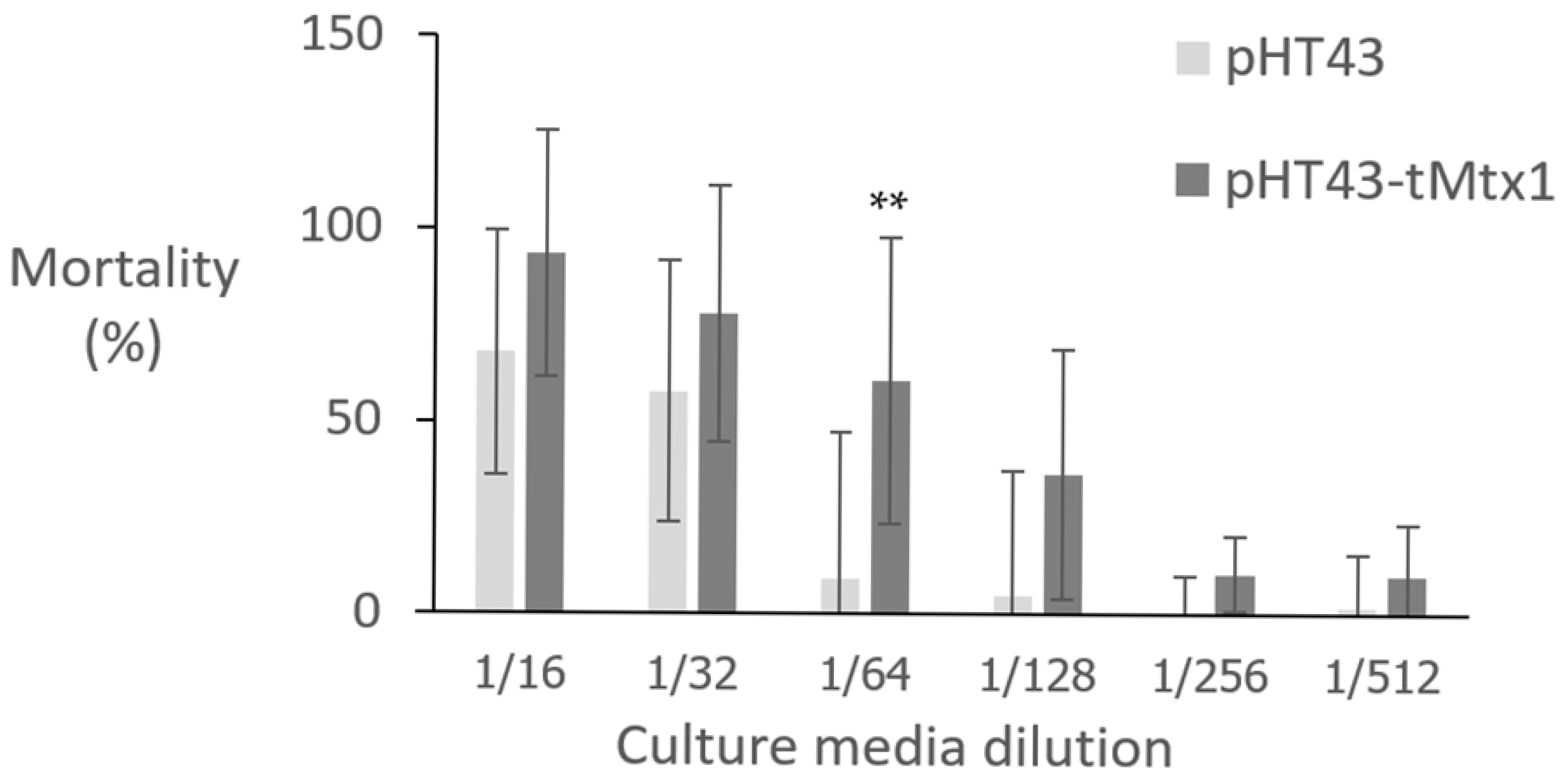 2.6. Construction of pHT43-tMtx1, Culture Collection, and Larvicidal Activity Assay Against Culex quinquefasciatus Larvae