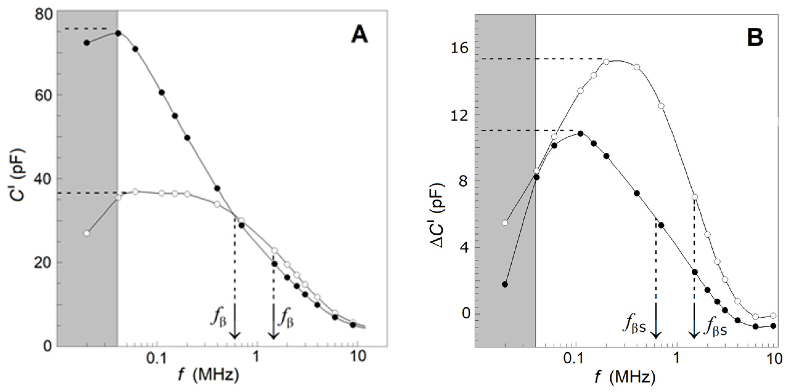 As previously reported, the temperature-corrected changes at Ts of ΔY′(f), ΔY″(f), ΔC′(f) and ΔCd″(f) of control RBCs isolated from blood without inflammation were close to those obtained with their isolated and resealed RBC ghost membranes. This finding, combined with the usage of a differential method of measurement eliminating the impact of all secondary processes, indicates that these changes were dominated chiefly by the denaturation of the major cytoskeletal protein spectrin and the subsequent threshold alteration of the plasma membrane. Based on the assumption that the dielectric activity of denatured spectrin is nil, the above-mentioned dielectric changes at Ts were assumed to represent the contribution of the native spectrin network to the dielectric properties of plasma membranes just prior to Ts.