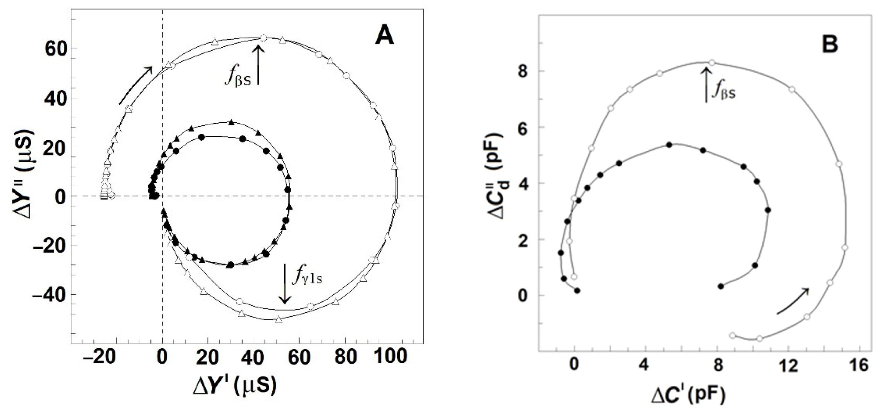 Figure 3 represents the complex plane plots of the spectrin-linked portions of the admittance (Δ