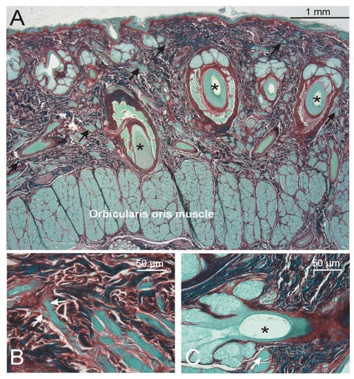 Upper and lower lips (Figure 1). Right after the lip vermilion zone, both vibrissae and vellus hair roots were embedded in dense connective tissue (min–max thickness of this layer: 1.8–2.7 mm) intermingled with numerous bundles of striated muscle fibers. These muscle fibers showed a close relation to the hair roots of both hair types, and reached the dermis close to the epidermal layer. At these places, the muscle fibers showed finger-like endings in contact with the dermal collagen network without a specific orientation of the surrounding collagen. While the striated muscle fibers of the orbicularis oris muscle (min–max total thickness between 1.0–1.4 mm) showed diameters between 40 and 70 µm, the radiating muscle fibers had diameters of 30 to 50 µm, thinning towards 20 µm prior to their finger-like endings.