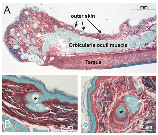 Appearance of the eyelid. (A). Overview: the orbicularis oris muscle is clearly separated from the tarsus and the thin connective tissue towards the outer skin. At the tip of the lid (left side), single muscle bundles communicate with the lashes. (B,C) show examples of small vellus hairs (asterisks) of the outer lid skin. At the level of the sebaceous glands (arrows), no smooth muscles are present. (A–C): Sirius red staining.