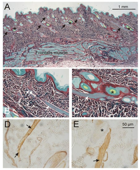 Appearance of the arrector pili muscle (arrows) in the frontal region. (A). Overview: each vellus hair complex, mainly containing of 2–3 hairs (asterisks), showed a well developed arrector pili muscle. There was no direct connection to the muscle fibers of the frontalis muscle. (B,D). Towards the epithelium, the arrector pili became smaller and showed few and short splitting. (C,E). The origin of the arrector pili was at one side of the connective tissue sheath of the vellus hair roots superficial to the bulb. (A–C): Sirius red staining. (D,E): Smooth muscle alpha actin staining. (B–E): Same magnification.