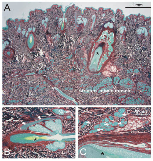 (A). In the lip regions, numerous striated muscle bundles (arrows) separated from the orbicularis oris muscle and ran along the vibrissae hair roots (asterisks) to reach the superficial part of the dermis right next to the epidermis. (B). At places, the striated muscle fibers formed finger-like endings (arrows). (C). The striated muscle fibers (arrow) were also in close contact with the short vellus hair roots (asterisks). No smooth muscle bundles were detected in this part of the skin. (A–C): Sirius red staining.