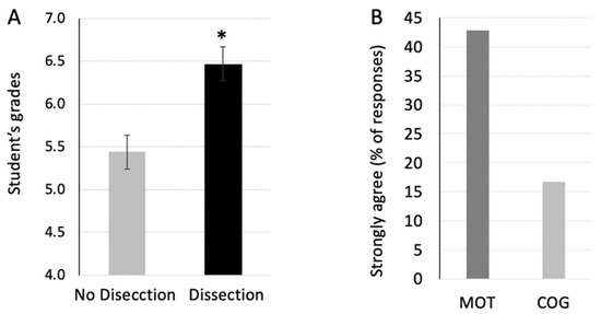 (A). Students' grades obtained in the final exam of Human Anatomy I—Musculoskeletal system. Data are expressed as mean ± standard error of the mean (grades scale from 0 to 10). The dissection session was associated with a 10% increase in the final exam grades (F1,51 = 12.71, p < 0.001). (B). Percent of strongly agree responses in the questionnaire to motivational questions (MOT) or cognitive ones (COG). Note that the motivational component of the questionnaire scored 25% higher than the cognitive one. * indicates significance at p < 0.01.
