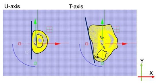 The tangent line of the bone cortex at the most prominent part of the palmar side in a transverse section, 4 cm from the articular surface, was set as the U-axis (Figure 4). The T-axis was then defined as a straight line passing through the most prominent part of the palmar volar rim and the prominent part of the palmar cortex of the scaphoid fossa in a transverse section passing through the most prominent part of the volar rim (Figure 4). The angle between the T-axis and the U-axis was measured as the angle of rotation of the metaphysis relative to the diaphysis [13].