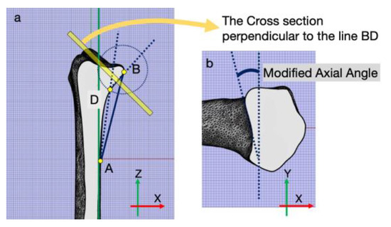 Measurement of sagittal angle and modified axial angle: (a) The same method was used to determine points A and B, as in Figure 6. Point D on the palmar cortex is plotted in the sagittal plane so that the length of D is the determined value of the teardrop length. The angle between AD and BD is measured as the sagittal angle. (b) The plane perpendicular to BD is the modified transverse plane and the axial angle is measured on that plane.