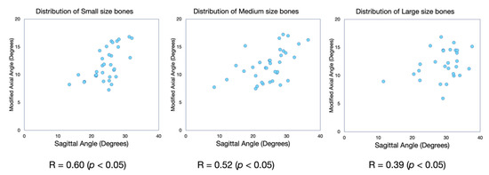 The subgroup analysis was performed by dividing all models into three groups based on the bone width: lower 1/3 (range from 21.3 to 25.6 mm; small), middle 1/3 (range from 25.7 to 28.0 mm; medium), and upper 1/3 (range from 28.1 to 35.3 mm; large) with 33, 35, and 33 cases in the small, medium, and large groups, respectively. In the small and medium groups, a moderate correlation was observed between the sagittal and modified axial angles. However, the correlation between the sagittal and modified axial angles was lower in the large group (Figure 8). These results indicate that in bones with moderate or smaller widths, it is possible to create implants that match the shape of the rim. This can be achieved by preparing several variations correlating the angle of bending in the sagittal plane with the angle in the transverse plane. Conversely, in bones with large widths, the variation of the volar rim in the transverse and sagittal planes is large, causing it to be difficult to design an implant matching the shape of the volar rim even if multiple variations can be prepared. Possibly, the ulnar distal part of the plate should be adjustable to match the anatomy of the individual volar rim.