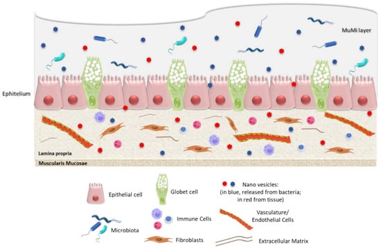 Enterocytes, the cells responsible for the absorption of nutrients, and goblet cells, the elements secreting the mucus that covers the intestinal wall, are the most common cytotypes that make up the bowel epithelium. The MuMi layer represents the first line of defense against various types of stress, such as ingested material, hydrochloric acid, proteolytic enzymes, etc., that the bowel is exposed to. The mucus, synthesized and secreted by goblet cells, is colorless, since it is mainly composed of water (up to 95%), lipids and small proteins. Its mechanical and viscoelastic properties are guaranteed by the presence of high-molecular-weight glycoproteins, identified as mucins [37,38]. The mucus is denser at the epithelial level and less so closer to the lumen, being also exposed to bacterial proteolytic activity. In fact, different microbial species of the normal microbiota are present in the MuMi layer. This allows the formation of a layer innermost to the intestinal lumen, that we call for the first time the “MuMi layer”, produced by the union of the mucus layer, microorganisms, and soluble factors, including extracellular vesicles (EVs) [39]. EVs represent the main dialogue tool between the microbiota and human cells of the mucosal layer, including not only epithelial cells but also fibroblasts and immune elements distributed in the lamina propria.