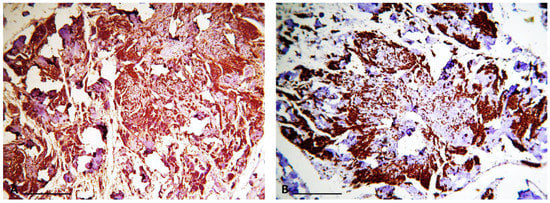 Immunohistochemical profile of neuroblastoma-like schwannoma (10× objective lens): (A) Schwann cells show strong and diffuse positivity for S100 marker; (B) Tumor cells are focally stained by Neuron Specific Enolase (scale bar = 100 μm).